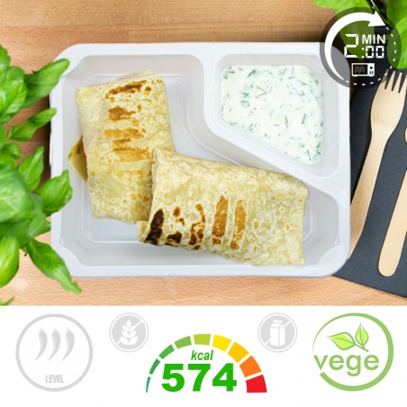 Składniki:Tortilla PSZENNA, Papryka kolorowa trio, Woda, Cukinia, Ciecierzyca (sucha), Marchew, TWARÓG chudy, JOGURT naturalny (2% tł.), Cebula, Cebula, Rzepakowy olej, Majonez domowy (olej rzepakowy, żółtka JAJ, musztarda (zaw.GORCZYCĘ), Natka pietruszki, Kolendra, Ketchup, Daktyle, Czosnek, Sok z cytryny, Koper ogrodowy, Sól, Papryka chili, Tymianek, Cynamon, przyprawy.