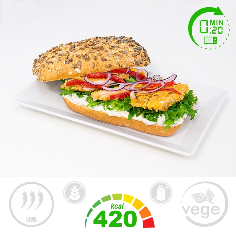 Bułka pszenna z ziarnami, z kurczakiem DELUXE, sałatą, papryką, czerwoną cebulą i sosem tatarskim.