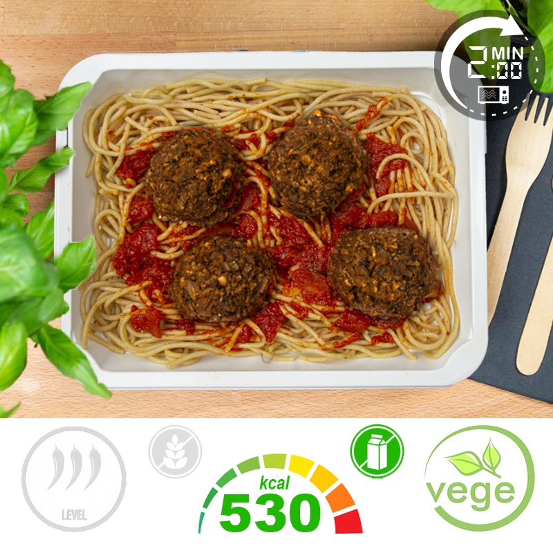 Wegańskie klopsiki podane na razowym spaghetti z sosem marinara.