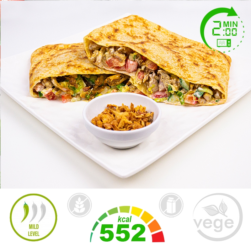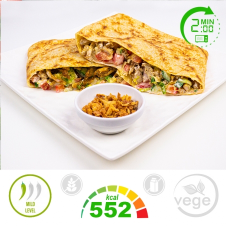 Naleśnik gyros ze świeżymi warzywami i sosem czosnkowym.