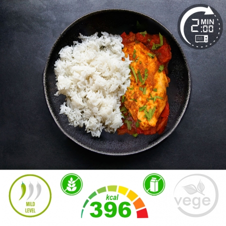 Składniki: kurczak [pierś z kurczaka, olej roślinny, koncentrat pomidorwy, przyprawy], peperonata [pomidory konserwowe (pomidory obrane krojone, sok pomidorowy, sól, regulator kwasowości), koncentrat pomidorwy 30%, cebula, papryka czerwona, przyprawa garam masala (kmin rzymski, kolendra, pieprz czarny, kardamon, goździki, CYNAMON, pieprz cayenne), olej roślinny, woda, kolendra, przypawy], ryż [ryż, woda, przyprawy].